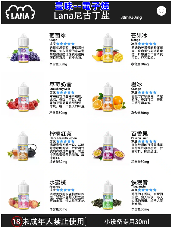 LANA煙油提供多種口味選擇,包括傳統煙草味、清新水果味、冰爽薄荷味及獨特甜味等,充分滿足不同用戶的多樣化需求。