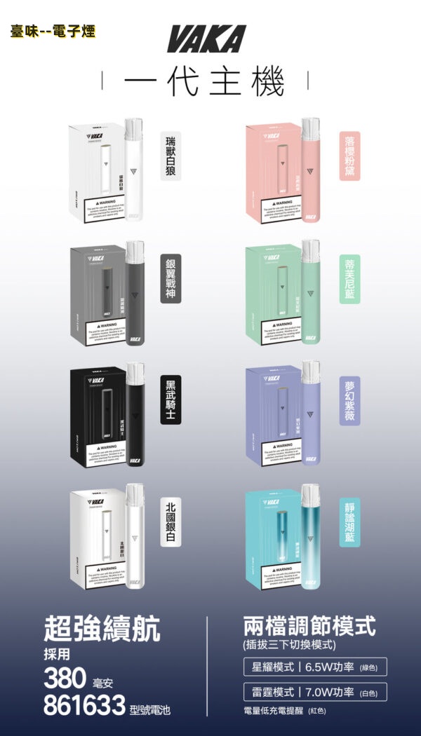 當前推出的VAKA 一代電子煙主機,是專為台灣市場量身打造的一款電子煙主機,與VAKA、ILIA、殺小、SP2S、LANA等主流電子煙品牌煙彈都能完美兼容。